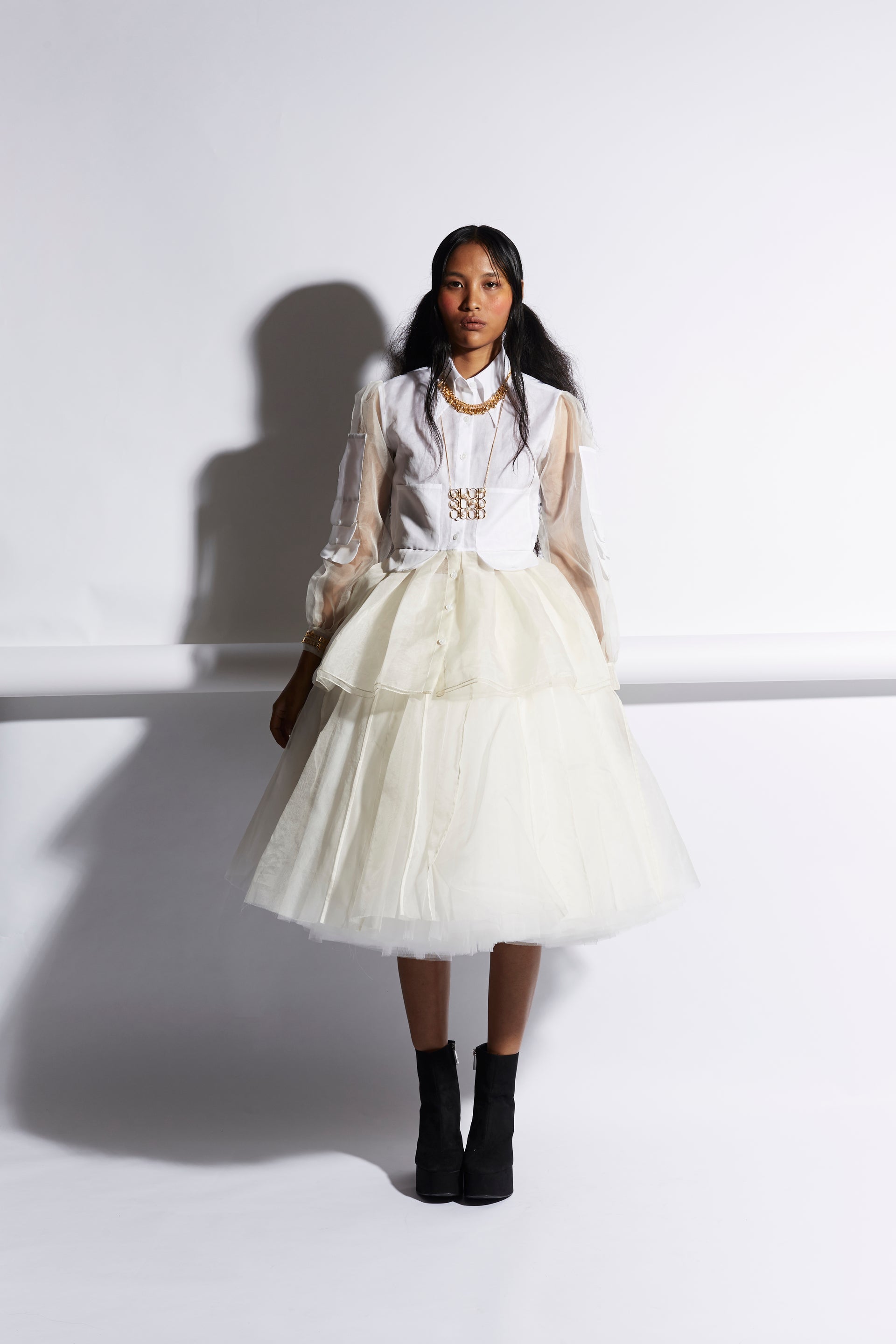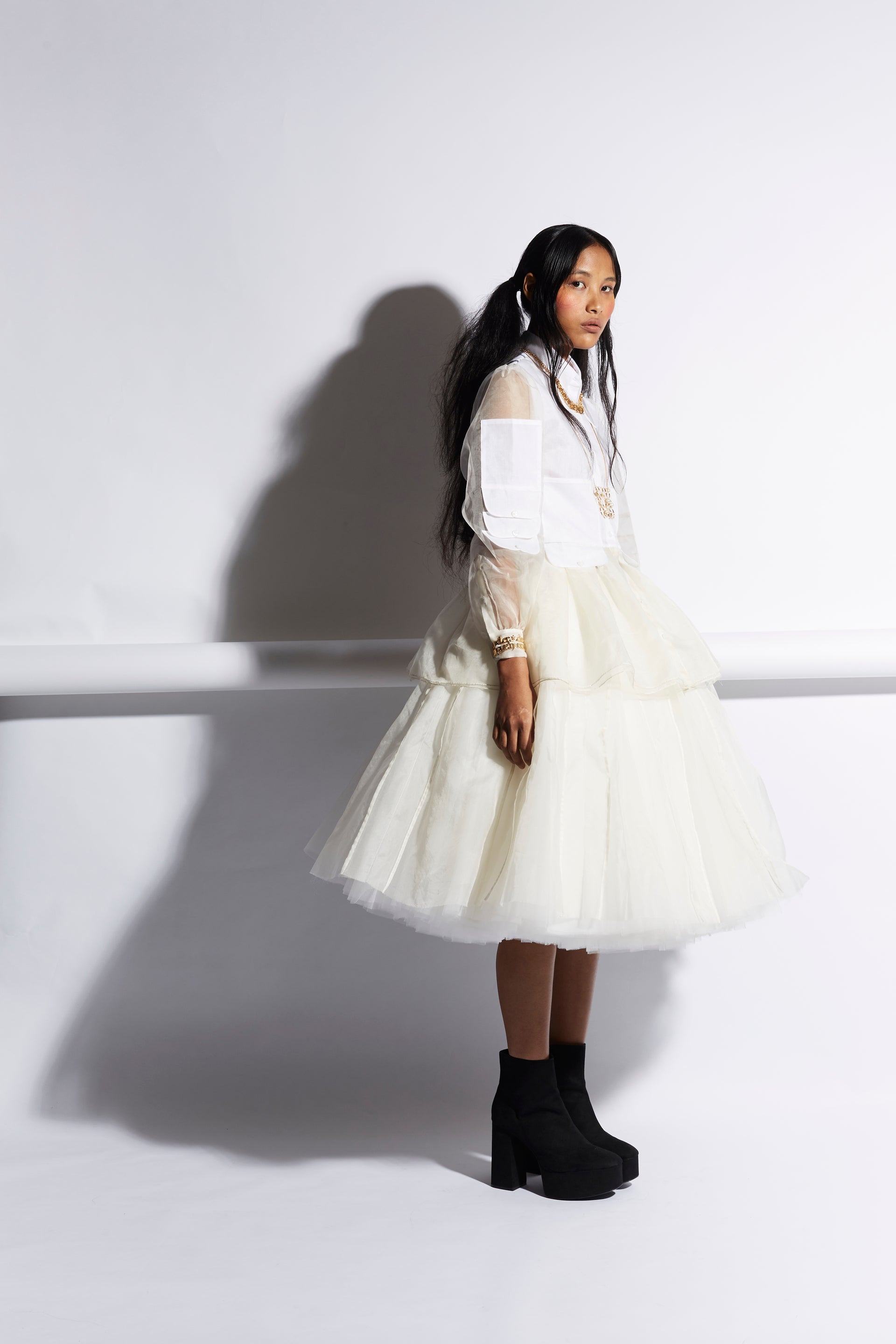 A layered silk organza and ivory tulle skirt with signature exposed seam panels all around the flare.